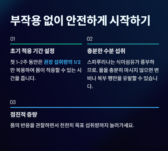혹시 스피루리나의 흡수율을 높이는 복용 시간이 따로 있을까요? 아니면 부작용 없이 안전하게 시작하는 방법이 궁금하신가요?