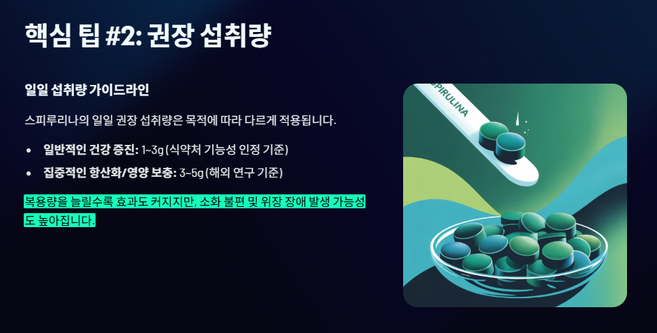 | 집중적인 항산화/영양 보충 | 3~5g | 해외 연구 및 고강도 보충을 위한 용량. |