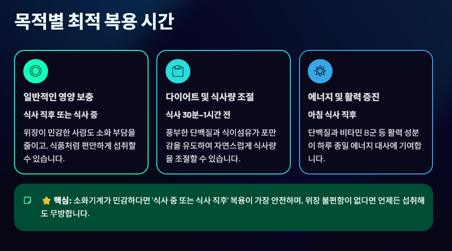 | 에너지 및 활력 증진 | 아침 식사 직후 | 단백질과 비타민 B군 등 활력 성분이 하루 종일 에너지 대사에 기여. |