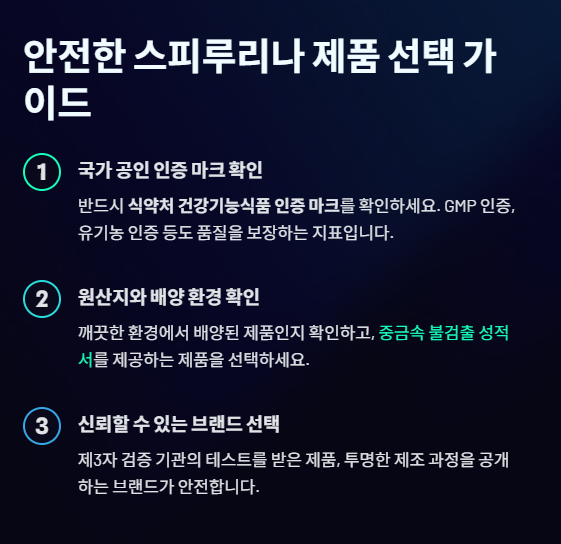 • 원산지 확인: 깨끗한 환경에서 배양된 제품인지 확인하고, 중금속 불검출 성적서 등을 확인하는 것이 가장 안전합니다.