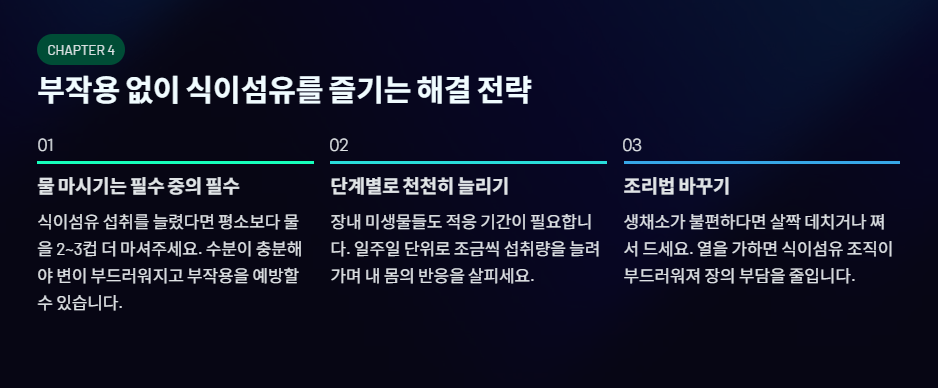 부작용이 무서워서 식이섬유를 멀리할 필요는 없습니다. 몇 가지 간단한 원칙만 지키면 안전하게 그 효능을 누릴 수 있습니다.