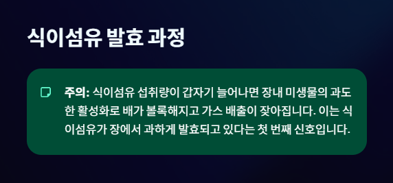 식이섬유가 대장에 도달하면 장내 미생물들이 이를 먹이 삼아 발효를 시작합니다. 이 과정에서 필연적으로 가스가 발생하는데, 식이섬유 섭취량이 갑자기 많아지면 미생물이 과도하게 활성화되면서 장내 가스가 급격히 늘어납니다. 배가 볼록하게 나오고 헛배가 부른 느낌, 그리고 잦은 가스 배출은 식이섬유가 장에서 과하게 발효되고 있다는 첫 번째 신호입니다.