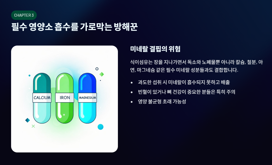 식이섬유는 장을 지나가면서 독소와 노폐물만 흡착하는 것이 아니라, 칼슘, 철분, 마연, 마그네슘 같은 소중한 미네랄 성분들과도 결합합니다. 식이섬유를 너무 과하게 먹으면 이런 필수 미네랄들이 흡수되지 못하고 대변과 함께 빠져나가게 됩니다. 특히 빈혈이 있는 분이나 뼈 건강이 중요한 분들에게 고함량의 식이섬유 섭취는 오히려 영양 불균형을 초래할 수 있습니다.