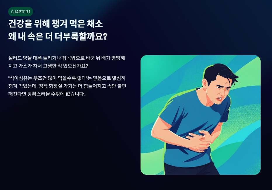 여러분, 건강을 생각해서 평소보다 샐러드 양을 대폭 늘리거나 흰 쌀밥 대신 잡곡밥으로 식단을 바꾼 뒤에 이상하게 배가 빵빵해지고 가스가 차서 고생한 적 없으신가요? "식이섬유는 무조건 많이 먹을수록 좋다"는 믿음으로 열심히 챙겨 먹었는데, 정작 화장실 가기는 더 힘들어지고 속만 불편해진다면 정말 당황스러울 수밖에 없습니다.