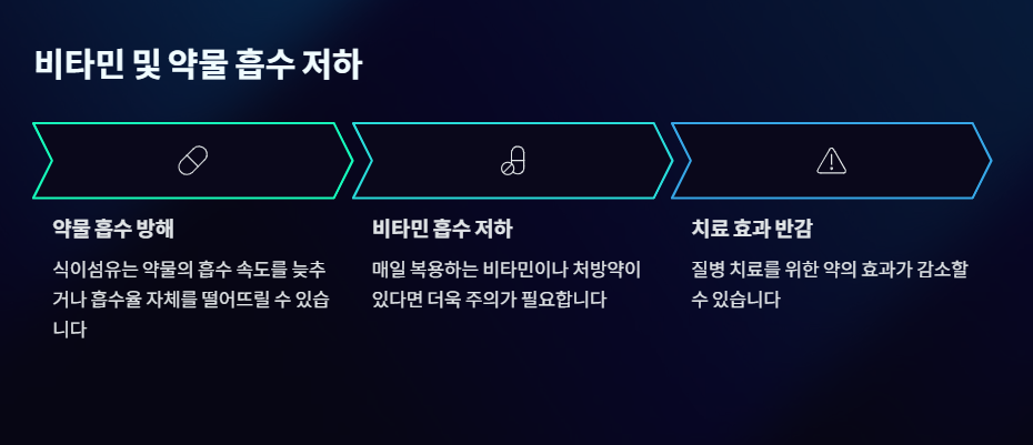 비타민이나 매일 복용하는 처방약이 있다면 더욱 주의해야 합니다. 식이섬유는 약물의 흡수 속도를 늦추거나 흡수율 자체를 떨어뜨릴 수 있습니다. 건강해지려고 먹은 식이섬유가 정작 질병 치료를 위한 약의 효과를 반감시킨다면 정말 속상한 일이겠죠?