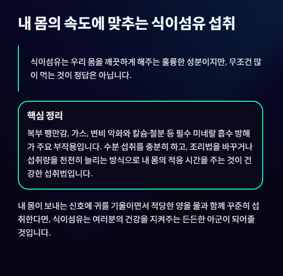 식이섬유는 우리 몸을 깨끗하게 해주는 훌륭한 성분이지만, 무조건 많이 먹는 것이 정답은 아닙니다. 복부 팽만감이나 영양 흡수 방해 같은 부작용은 대개 '너무 갑자기', '너무 많이', '물 없이' 먹었을 때 발생합니다. 내 몸이 보내는 신호에 귀를 기울이면서 적당한 양을 물과 함께 꾸준히 섭취한다면, 식이섬유는 여러분의 건강을 지켜주는 든든한 아군이 되어줄 것입니다. 오늘부터는 무리한 식단 변화보다는 내 속이 편안한 정도를 찾아가는 지혜로운 건강 관리를 시작해 보세요!