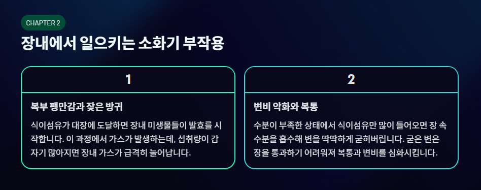 변비를 해결하려고 먹은 식이섬유가 오히려 변비를 부를 수도 있습니다. 식이섬유는 물을 흡수해서 변을 부드럽게 만들어야 하는데, 만약 몸에 수분이 부족한 상태에서 식이섬유만 많이 들어오면 장 속에 있는 수분을 몽땅 빨아들여 변을 딱딱하게 굳혀버립니다. 이렇게 굳은 변은 장을 통과하기 어려워져 복통을 유발하고 변비를 심화시킵니다.