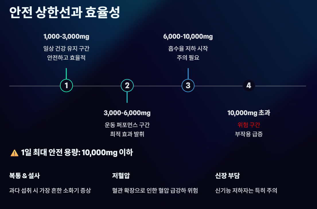 ⚠️ 안전 상한선: 1일 최대 10g (10,000mg) 이하 유지