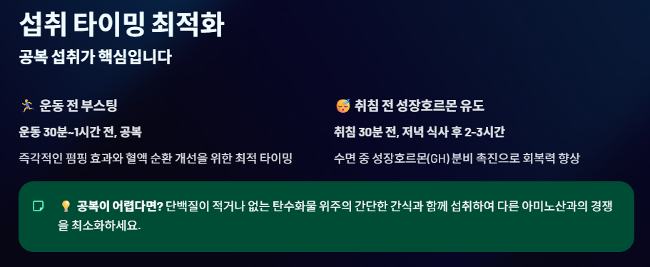 운동 전 펌핑 효과를 최대화하려면, 아르기닌을 운동 시작 30분~1시간 전, 완전히 공복인 상태에서 섭취해야 합니다. 이렇게 해야 체내 흡수가 빨라져 혈액 순환 효과가 운동 중에 즉각 나타납니다.