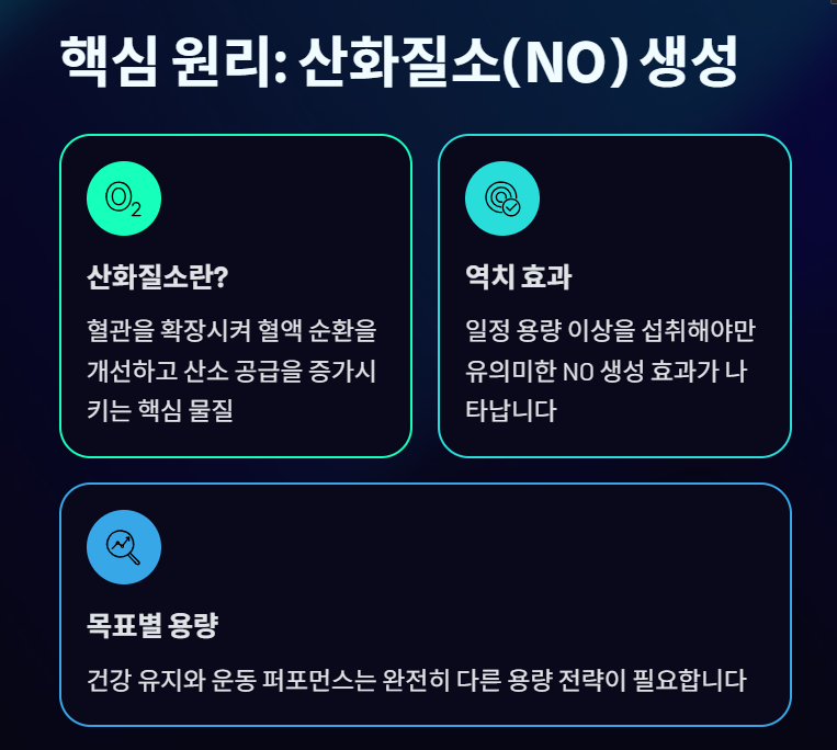 정답은 '목표'에 따라 섭취량이 달라진다는 것입니다. 아르기닌은 단순히 결핍을 막는 비타민이 아니라, 원하는 신체 반응(산화질소 생성)을 유도하기 위해 특정 역치 이상의 용량을 필요로 하는 기능성 아미노산이기 때문입니다.