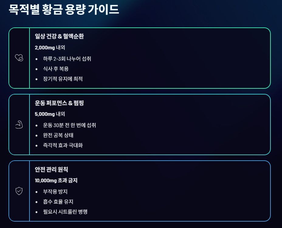 아르기닌 섭취량은 크게 두 가지 목표에 따라 나뉩니다. '혈액 순환 및 건강 유지'를 위한 일상적인 용량과, '운동 능력 극대화'를 위한 고강도 용량입니다.