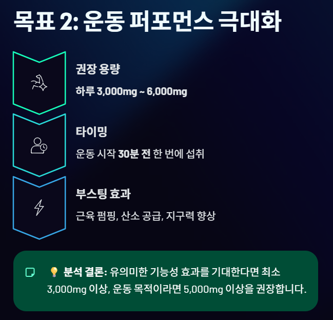 💪 운동 퍼포먼스 및 펌핑 극대화 (3,000mg ~ 6,000mg)