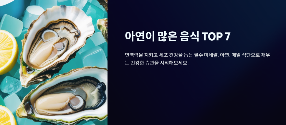 이 글에서는 일상에서 쉽게 접할 수 있는 아연이 풍부한 음식 TOP 7을 정리하고, 어떻게 먹어야 더 잘 흡수되는지 핵심 팁을 전해 드립니다.