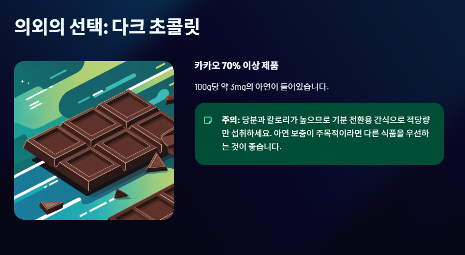 • 주의: 아연 섭취를 위해 초콜릿을 과하게 먹으면 당분과 칼로리 문제가 발생할 수 있으니, 기분 전환용 간식으로 적당량 섭취하는 것을 권장합니다.