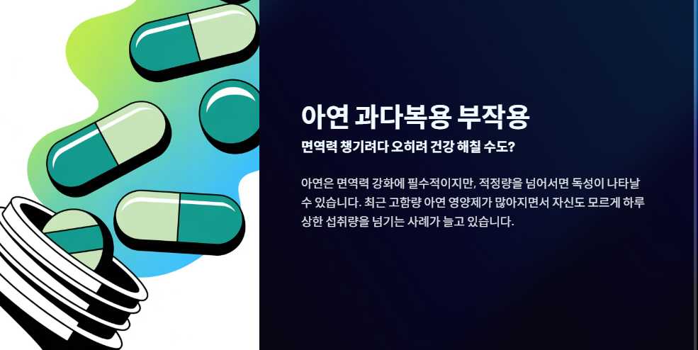 아연은 면역력 강화에 필수적이지만, '미량 미네랄'인 만큼 적정량을 넘어서면 독성이 나타날 수 있습니다. 특히 최근 고함량 아연 영양제가 많아지면서 자신도 모르게 **하루 상한 섭취량(35mg)**을 훌쩍 넘겨 장기 복용하는 사례가 늘고 있어 주의가 필요합니다.