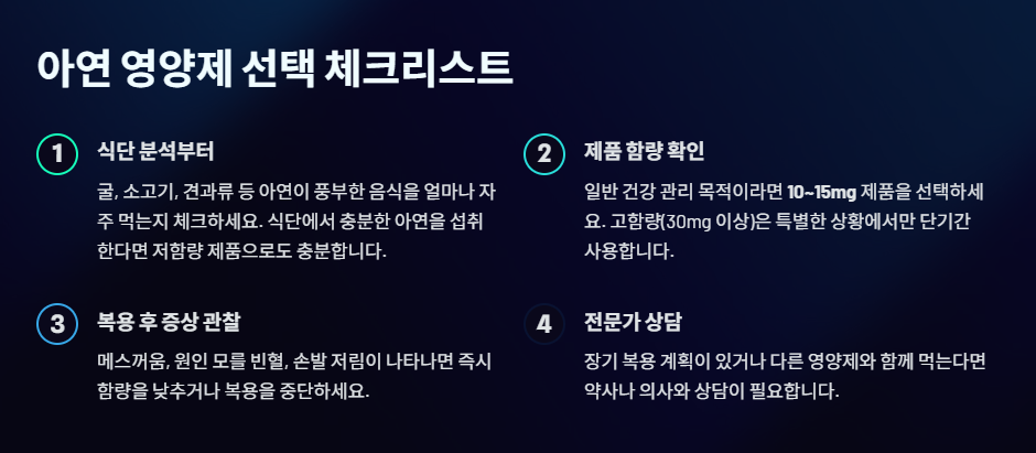 아연 영양제를 선택할 때는 본인의 식단에서 굴, 소고기 등 아연이 풍부한 음식을 얼마나 먹는지 먼저 체크해 보세요. 만약 영양제 복용 후 원인 모를 빈혈, 손발 저림, 메스꺼움이 나타난다면 즉시 함량을 낮추거나 전문가와 상담해야 합니다.