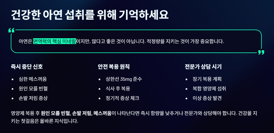 • 대처법: 아연 섭취 후 속이 울렁거린다면 즉시 복용을 중단하거나 식사 직후로 복용 시간을 바꿔야 합니다.