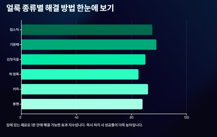얼룩 지우는 1분 꿀팁으로 립스틱, 기름때, 피, 커피, 김칫국물까지 집에 있는 재료로 해결하세요. 옷·카펫·생활 얼룩 종류별 제거 방법과 주의사항을 2026년 기준으로 정리했습니다.