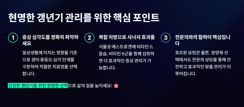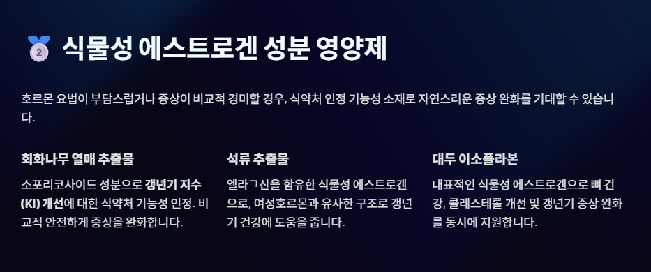 | 섭취 원칙 | 복합 처방: 식물성 에스트로겐과 비타민 D, 칼슘, 비타민 B군을 함께 섭취하여 시너지 효과를 노리세요. |
