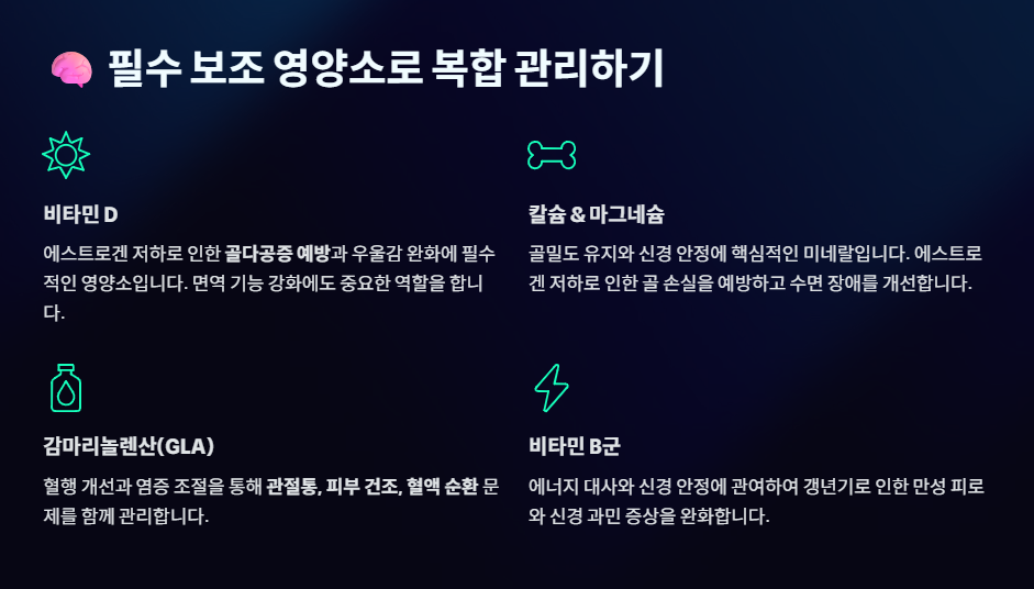 | 칼슘 및 마그네슘 | 골밀도 유지 및 신경 안정 | 에스트로겐 저하로 인한 골 손실 예방 및 수면 장애 개선 |
