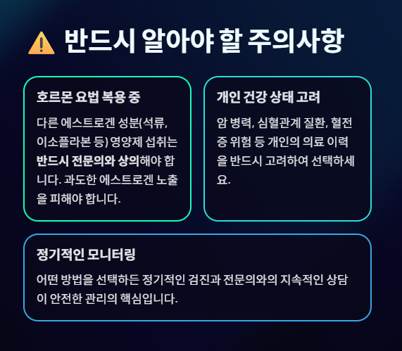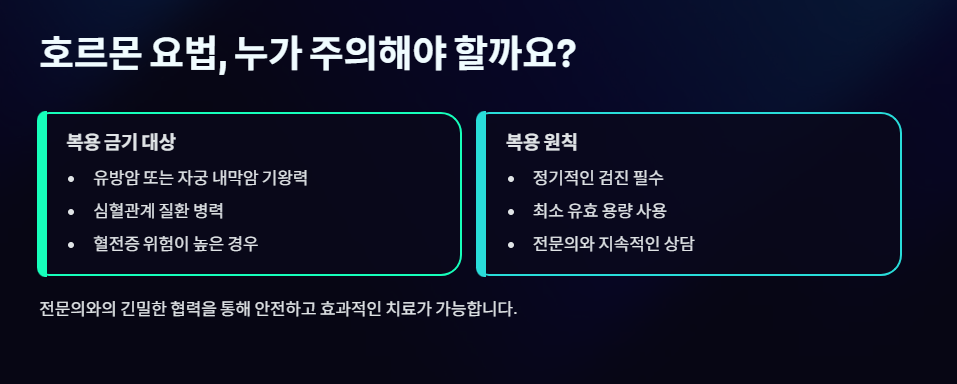 💡 중요: 호르몬 요법은 반드시 산부인과 전문의와의 충분한 상담과 검진(유방암, 자궁 내막암 검사 등)을 거쳐 최소 유효 용량으로 단기간 복용하는 것을 원칙으로 합니다.