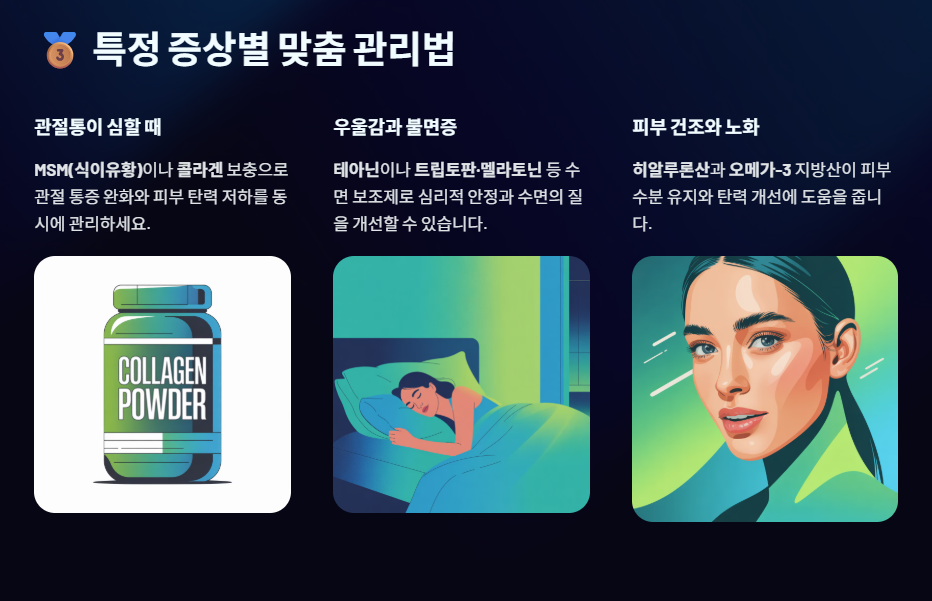 - 관절통 심할 때: **MSM(식이유황)**이나 콜라겐을 보충하여 관절 통증 및 피부 탄력 저하를 함께 관리합니다.