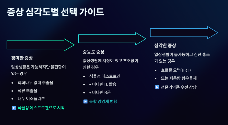 | 증상 심각도 | 심각 (일상생활 불가, 심한 홍조): 전문의약품(HRT) 우선 상담 |
