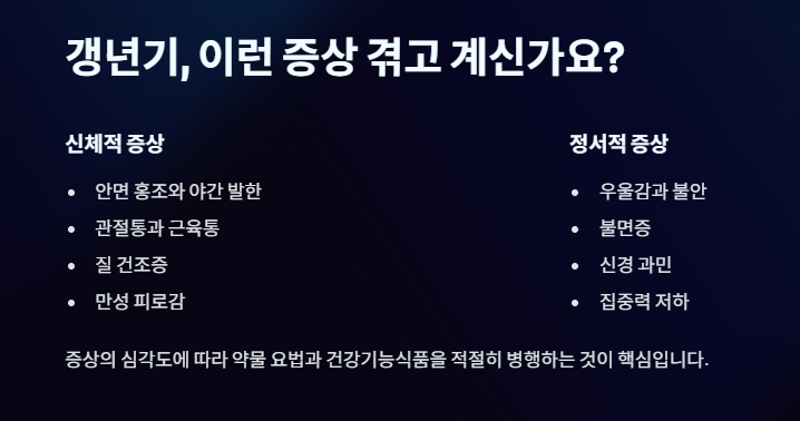 갱년기에 나타나는 특정 증상에 초점을 맞춘 영양제를 함께 복용하면 삶의 질을 더욱 높일 수 있습니다.