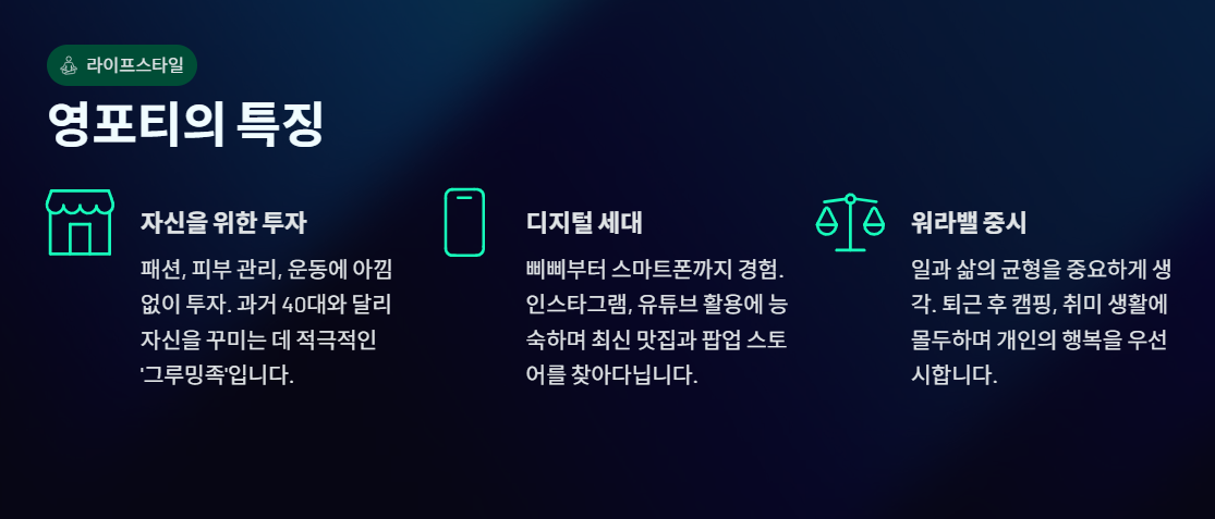 영포티는 아날로그와 디지털을 모두 경험한 세대입니다. 삐삐와 시티폰으로 시작해 스마트폰까지 능숙하게 다루죠. 이들은 인스타그램이나 유튜브 같은 SNS 활용에도 거부감이 없으며, 최신 유행하는 맛집이나 팝업 스토어를 찾아다니는 것을 즐깁니다. 젊은 세대(MZ세대)가 좋아하는 문화를 함께 공유하려는 욕구가 매우 강합니다.