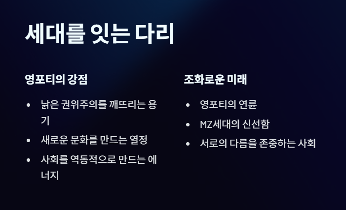 서로의 다름을 비난하기보다는, 영포티가 가진 연륜과 MZ세대가 가진 신선함이 조화를 이룬다면 우리 사회는 훨씬 더 살기 좋은 곳이 되지 않을까요? 오늘부터 주변의 40대 혹은 젊은 후배들에게 따뜻한 응원의 한마디를 건네보시는 건 어떨까요?
