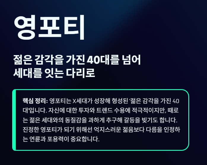 영포티는 과거 X세대가 성장해 형성된 '젊은 감각을 가진 40대'를 뜻합니다. 자신에 대한 투자와 트렌드 수용에 적극적이지만, 때로는 젊은 세대와 동질감을 과하게 추구해 갈등을 빚기도 합니다. 진정한 영포티가 되기 위해선 억지스러운 젊음보다 다름을 인정하는 연륜과 포용력이 중요합니다.