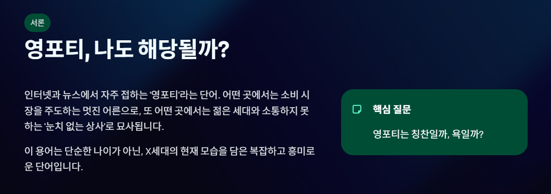 서로의 다름을 비난하기보다는, 영포티가 가진 연륜과 MZ세대가 가진 신선함이 조화를 이룬다면 우리 사회는 훨씬 더 살기 좋은 곳이 되지 않을까요? 오늘부터 주변의 40대 혹은 젊은 후배들에게 따뜻한 응원의 한마디를 건네보시는 건 어떨까요?