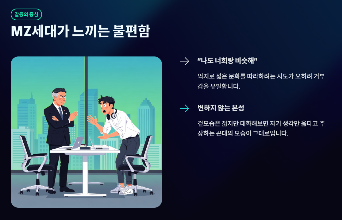 - 과도한 동질감 요구: "나도 너희랑 비슷해", "나 꽤 힙하지?"라며 억지로 젊은 세대의 유행어나 문화를 따라 하려 할 때 오히려 거부감을 느낀다는 것이죠.