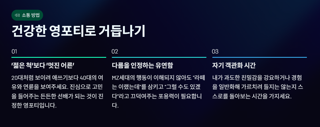 20대처럼 보이려고 애쓰기보다는, 40대만이 가질 수 있는 여유와 연륜을 보여주는 것이 더 매력적입니다. 억지로 유행어를 쓰기보다는 젊은 세대의 고민을 진심으로 들어주고, 실질적인 도움을 줄 수 있는 든든한 선배의 모습을 보일 때 진정한 '영포티'로 인정받을 수 있습니다.