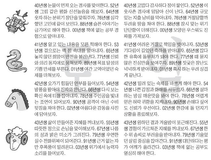| 띠 | 키워드 | 전체운 | 재물·일 | 연애·대인 |