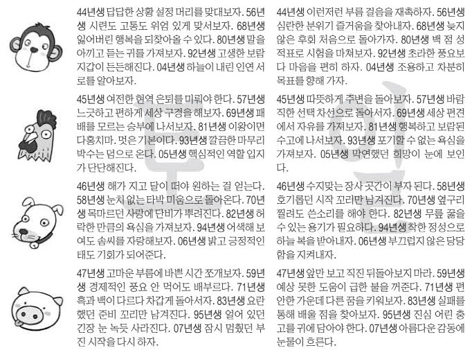 | 용띠 | 점검 | 한 주를 돌아보기 좋은 날이다. | 수입·지출 구조를 간단히 체크하자. | 감정 기복은 잠시 숨 고르기가 필요하다. |