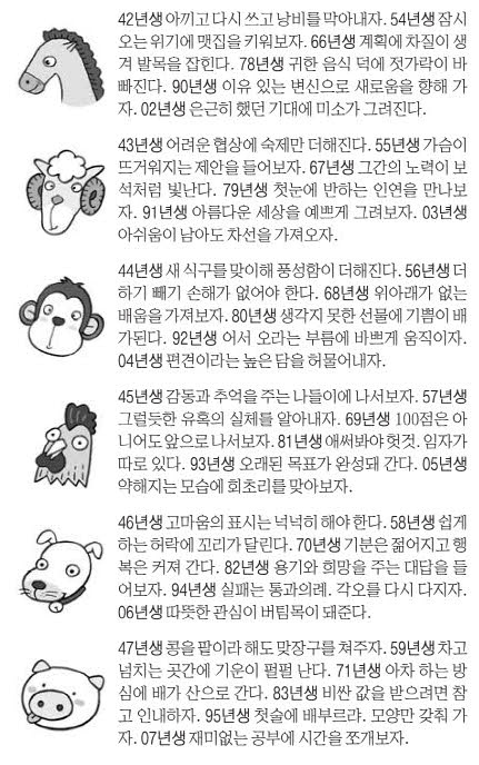 | 띠 | 키워드 | 전체운 | 직장·금전 | 연애·대인 |
