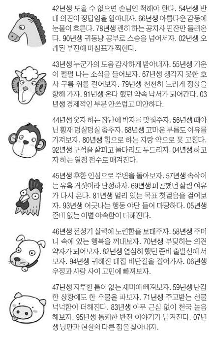 | 말띠 | 활동 | 몸이 바쁠수록 하루가 빨리 지나갑니다. | 중요 업무는 오전에 처리하는 것이 좋습니다. | 즉흥적인 농담은 수위를 조절해야 합니다. |