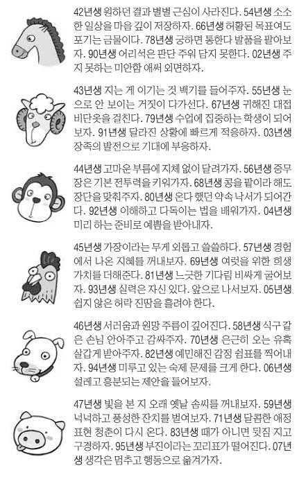 | 띠 | 키워드 | 전체운 | 직장·금전 | 연애·대인 |