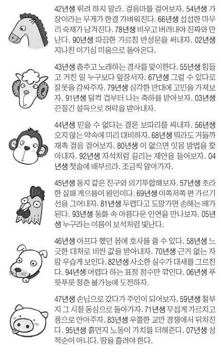 | 띠 | 키워드 | 전체운 | 직장·금전 | 연애·대인 |