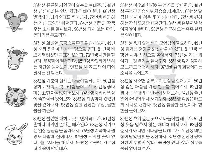 | 쥐띠 | 겸손과 절제, 지출관리 | 성급함 자제, 허리띠 졸라매기 |