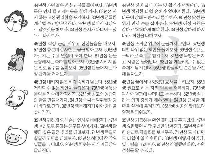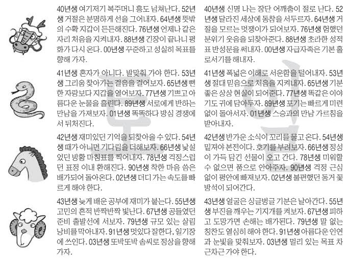 - 띠별 운세: 동양 12간지 중심, 꾸준함·조화·계획·광고·정보·휴식중시