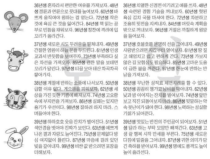 | 쥐띠 | 실속과 침착, 재충전 | 급한 결정 자제, 차분한 태도 |