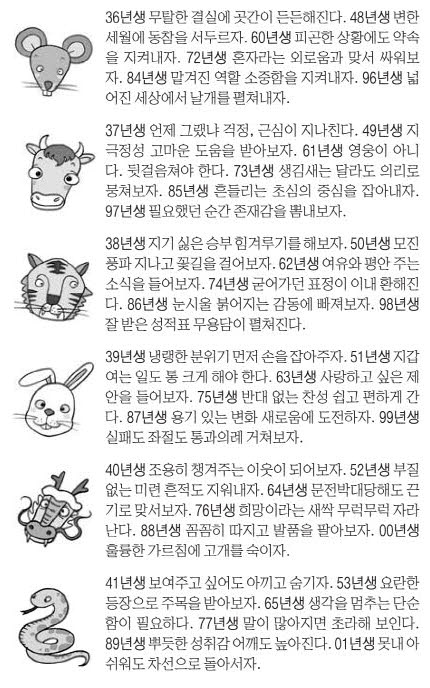 | 돼지띠 | 집안 경사, 자부심 상승 | 긍정유지, 기쁨 나눔, 휴식 채우기 |