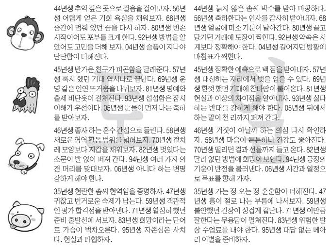 - 띠별 운세: 동양 12간지, 현실감각/내실/관계/감정관리/계획