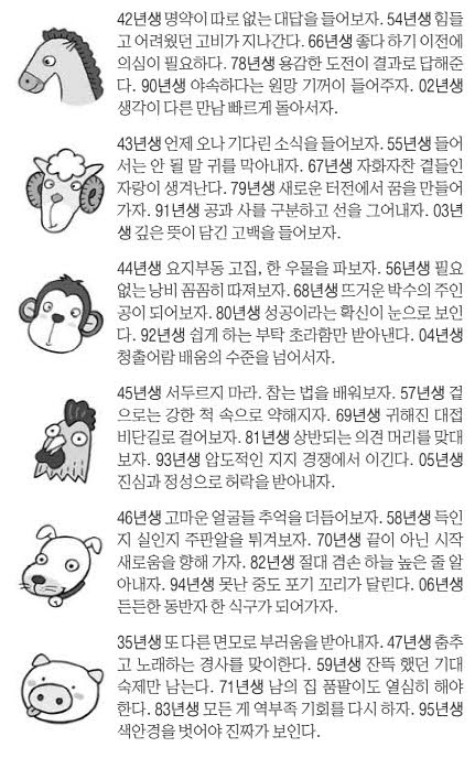 | 개띠 | 신중처리, 새도전 | 재능발휘, 봉사·도움기회 |