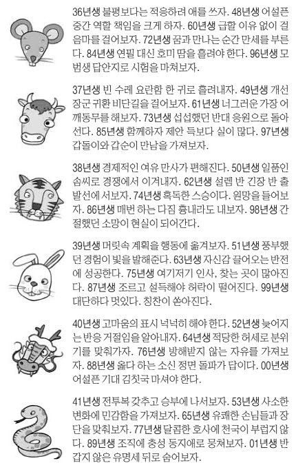뱀띠 태도·마음가짐에 따라 평가가 갈리는 날. 결과보다 배움으로 받아들이면 마음이 가벼워짐.