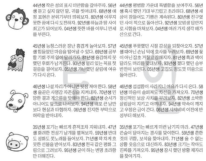 | 개띠 | 마음·몸 모두 쉬어야 하는 날. | 일·가사 모두 가볍게, 미뤄도 되는 일은 다음 주로 넘기기. |