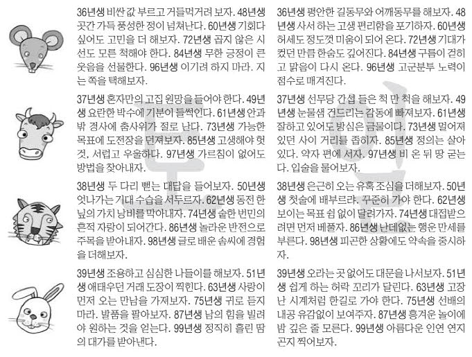 | 쥐띠 | 투자 유의 | 갈등 주의 | 스트레스 관리 |