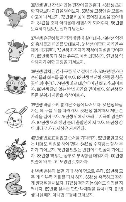 - 띠별 운세: 태어난 해의 동물띠(12간지)에 따라, 재물·직업·건강 등 실질적 운세 중심[2][3][6]